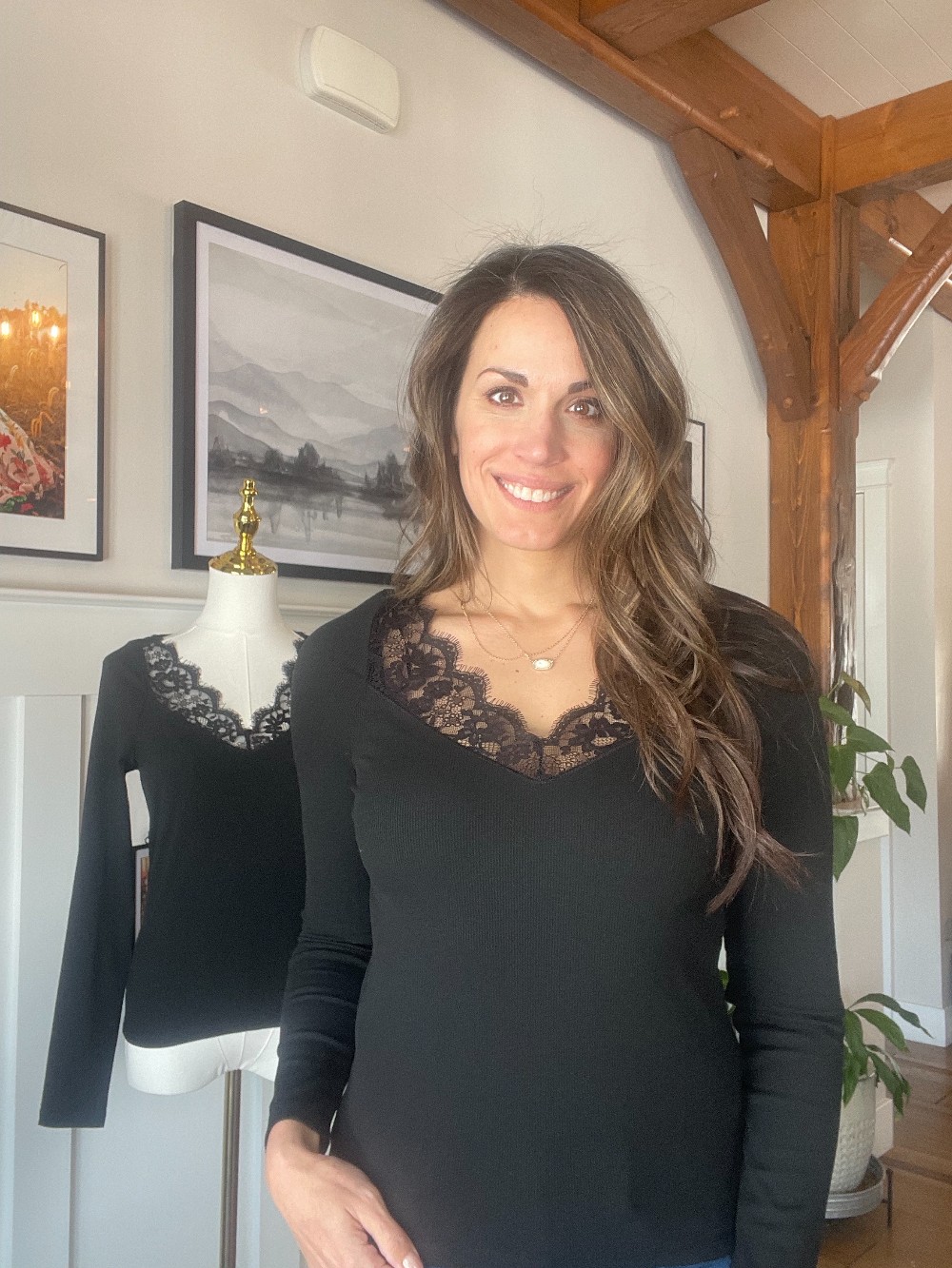 V-Neck Lace Trim Ribbed Knit Long Sleeve Top