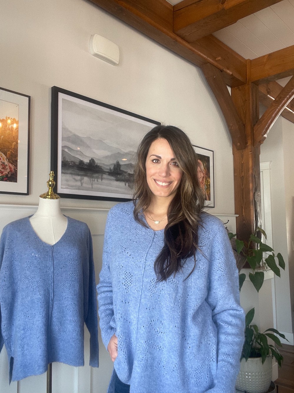 Blue V-Neck Knit Sweater, recycled polyester blend***Note: Size Small is S/M and size Medium is M/L***
